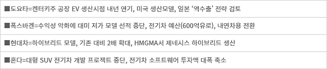 세계 최대 자동차 수요국인 미국에서 친환경차 확대 기조가 기존 내연기관차 우위로 전환되면서 한일 양국 기업의 전기차(EV) 생산과 연구개발, 지출 확대 전략이 전면 재조정되고 있다. 일본 도요타는 급기야 미국에서 생산한 차량을 일본 내수용으로 파는 시나리오까지 검토하고 있다.