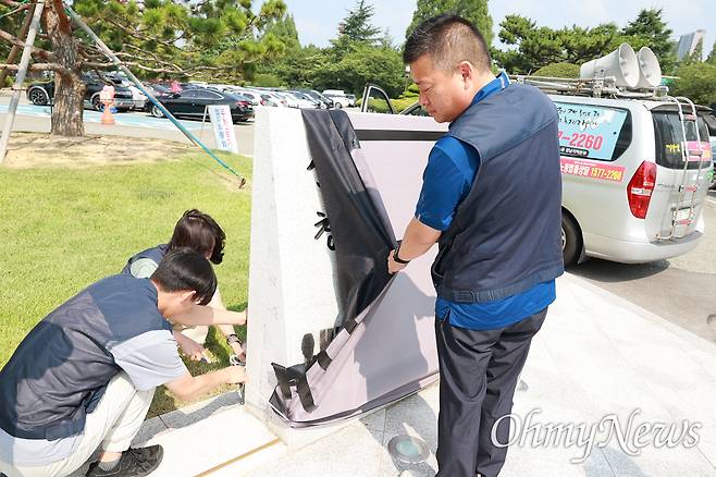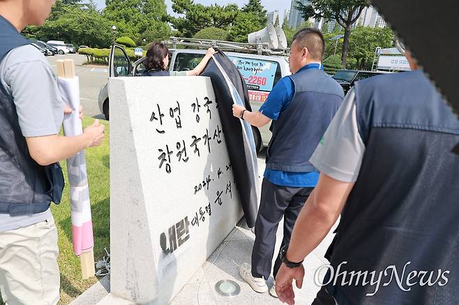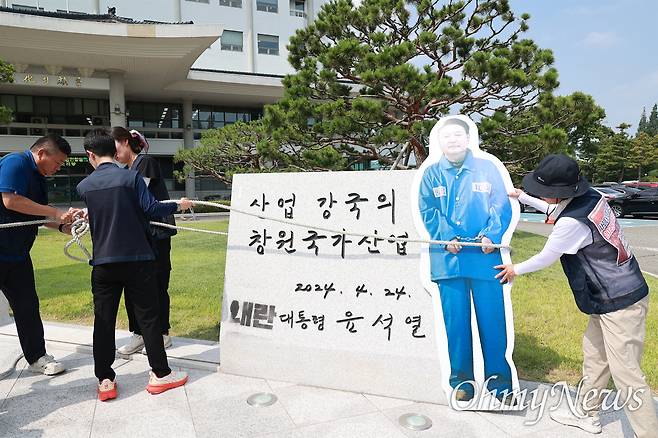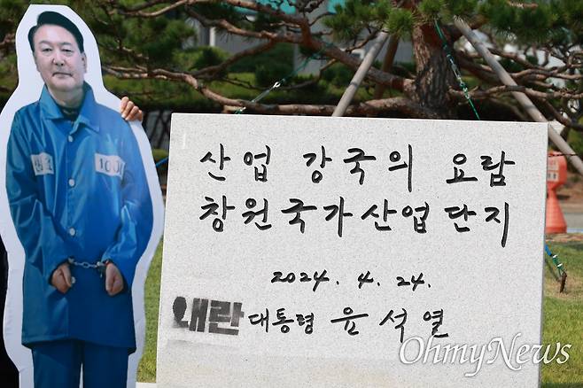 이후 민주노총 경남본부가 '대통령 윤석열' 앞에 스프레이로 '내란'이란 글자를 새겼고, 이후 창원시는 천을 씌워 볼 수 없도록 해놓았다. 이런 가운데 창원중부경찰서는 최근 민주노총 경남본부 간부를 재물손괴 혐의로 검찰에 송치했다.