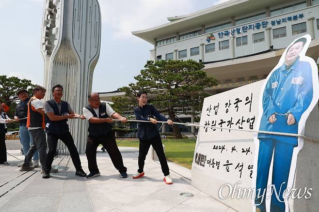 | ▲ "파면된 '내란 대통령 윤석열' 친필 표지석, 당장 철거해야" 민주노총 경남본부는 8일 오전 창원 한국산업단지공단 경남본부 앞에 있는 윤석열 전 대통령의 표지석을 철거를 촉구하며 밧줄을 묶어 끌어당겼다. 이들은 "파면된 윤석열 친필 표지석을 지금 당장 철거하고, 윤석열을 구속 수사하라"라고 했다. 민주노총 경남본부는 2024년 12월 3일 불법계엄 이후 표지판의 ‘대통령 윤석열’ 앞에 ‘내란’이란 글자를 새겼다. ⓒ 윤성효 |