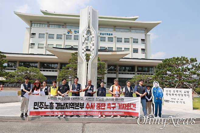 | ▲ 민주노총 경남본부는 8일 오전 한국산업단지공단 경남본부 앞에서 윤석열 전 대통령 친필 표지석 철거를 촉구했다. |
