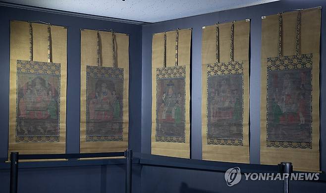 (서울=연합뉴스) 류효림 기자 = 8일 서울 종로구 국립고궁박물관에서 열린 '불교미술의 진수' 고려 사경과 조선 불화의 귀환' 일본 환수 문화재 언론 공개 행사에서 시왕도가 공개되고 있다. 2025.7.8