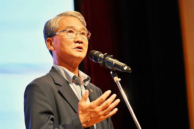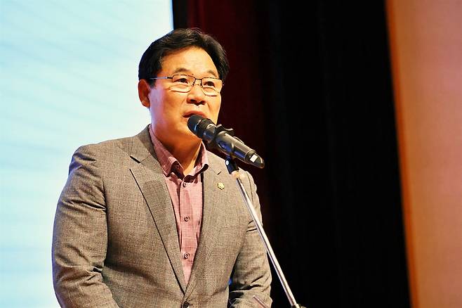 | ▲ 조용훈 시의회 의장이 "통합은 시민의 동의와 이해가 최우선"이라고 강조하며 축사를 전하고 있다. |