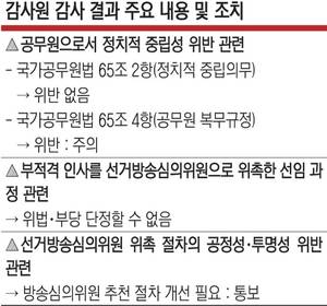8일 감사원이 공개한 감사 결과에 따르면, 이 위원장은 정치적 중립의무 위반 의혹과 관련해 주의 처분을, 방송통신심의위원회의 선거방송심의위원 선임과정 등 점검에서 개선방안 마련 통보 처분을 받았다. 감사원은 “이 위원장의 발언 내용 등을 종합적으로 보면 정치적 편향성·당파성을 드러내는 행위를 수차례 한 것으로, 정치적 중립성을 훼손할 가능성이 큰 경우에 해당한다”고 밝혔다. 방심위 선거방송심의위원 선임과 관련해서는 “선거방송심의위원 구성의 공정성과 투명성을 제고하는 방안을 마련하시기 바란다”고 통보했다.