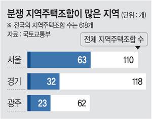 분쟁조합이 가장 많은 지역은 서울이었다. 서울 내 110개 지주택 중 63곳(57.3%)이 분쟁을 겪고 있다. 서울 다음으로는 경기(32곳·27.1%), 광주(23곳·37.1%)의 분쟁이 많았다.