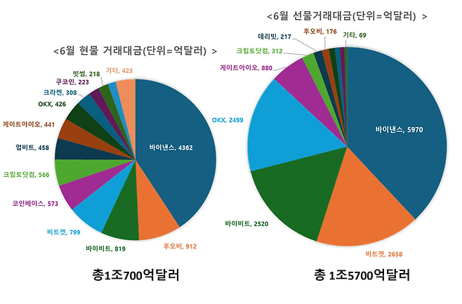 현물거래에서도 바이낸스가 전체의 40.76%(4362억달러)를 차지하며 압도적인 1위를 기록했다.