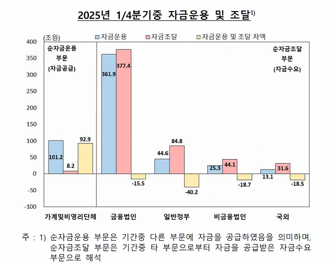 올해 1분기 가계 및 비영리단체의 자금 운용액은 101조2000억원으로 전 분기(71조2000억원) 대비 증가했다. 금융기관 예치금, 지분증권 및 투자펀드 등을 중심으로 운용 규모가 늘었다. 같은 기간 자금조달액은 8조2000억원으로, 금융기관 차입 증가세가 둔화하면서 조달 규모 역시 전 분기(8조6000억원) 대비 소폭 줄었다.