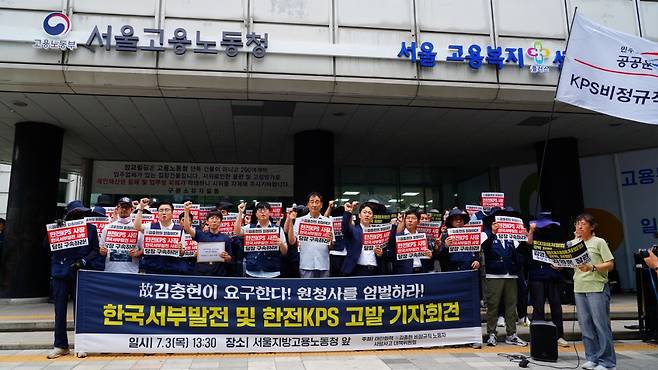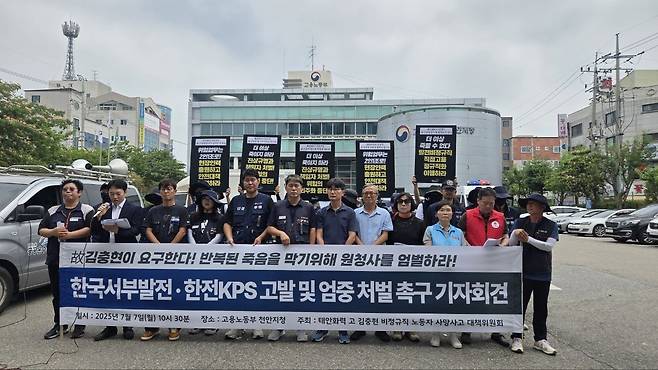 | ▲ 지난 7월 3일, 서울고용노동청 앞에서 고 김충현 노동자 중대재해 사망사고에 대해 대책위는 서부발전과 한전kps 원청의 책임을 묻는 고발 기자회견을 진행했다. |