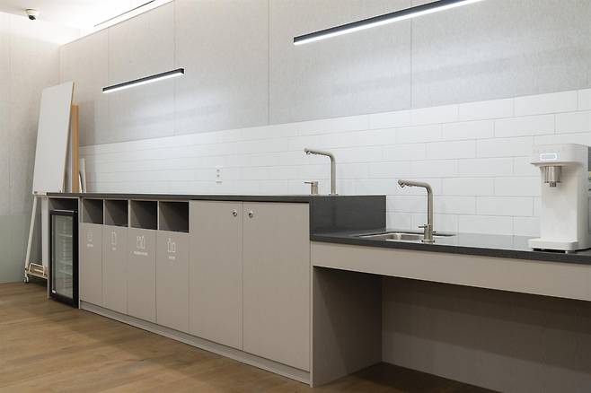 | ▲ 모임공간 브릭스 성수 룸에 설치되어 있는 낮은 싱크대 루트임팩트가 운영하는 헤이그라운드 브릭스 성수는 낮은 싱크대, 휠체어 바퀴 간섭이 없는 리셉션 데스크 등 휠체어 이용자나 어린이들도 쉽게 이용 가능한 접근성 요소가 돋보인다. |
