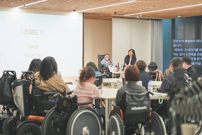 | ▲ 성수동 헤이그라운드 브릭스 성수에서 지난 2024년 10월 열린 무의 행사의 모습 무의가 사단법인 출범을 기념해 지난 10월에 열었던 행사. 연사와 참가자 중 휠체어 이용자가 다수 있었다. 헤이그라운드 브릭스 성수는 휠체어 이용자가 오를 수 있도록 연단 경사로가 있고 문자통역을 중계할 수 있는 별도 스크린 등 다양한 배리어프리, 유니버설디자인 요소를 반영한 모임 공간이다. |