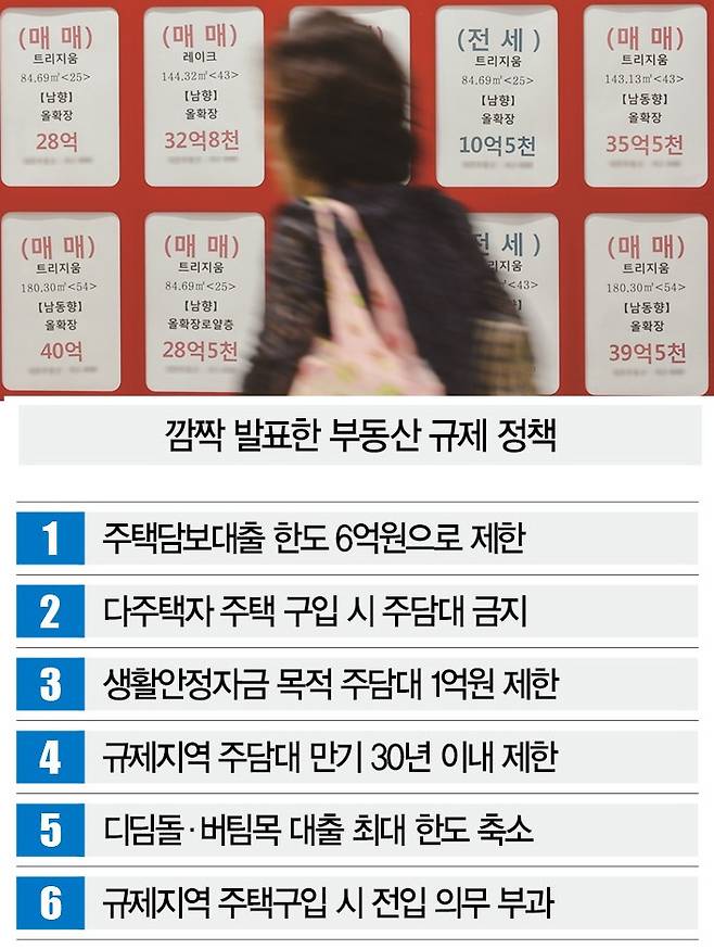 우선 주택담보대출 한도를 6억원으로 제한했습니다. 집을 살 때 은행에서 6억원 이상은 빌릴 수 없도록 규제한 겁니다. 수도권이나 규제지역 내 다주택자가 추가로 주택을 구입하거나 1주택자가 기존 주택을 처분하지 않고 추가 주택을 구입할 땐 주담대를 아예 빌릴 수 없게 했죠.