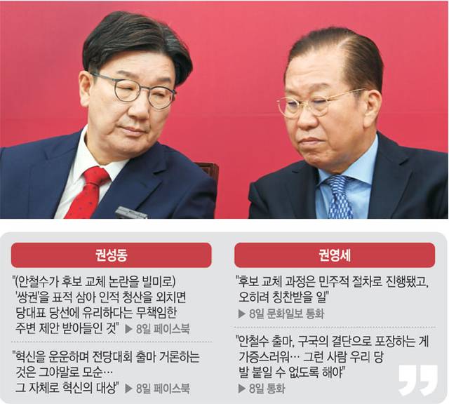 안철수 국민의힘 의원이 혁신위원장을 전격 사퇴하며 인적쇄신의 대상으로 사실상 지목한 권영세·권성동 의원은 8일 각각 “안 의원은 우리 당에 발을 붙일 수 없도록 하는 게 맞다” “분열의 언어로 혼란을 주장하고 있다”며 강하게 반발했다.
