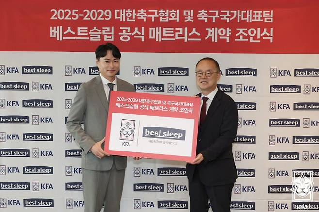 공식 협찬 계약 체결을 위한 조인식은 지난달 19일 이용수 대한축구협회 부회장과 김승희 전무, 베스트슬립 서진원 대표 등이 참석한 가운데 서울 신문로 축구회관에서 열렸다.
