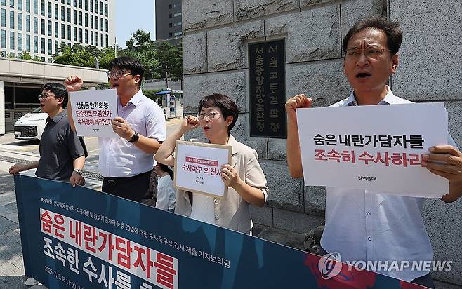 (서울=연합뉴스) 서명곤 기자 = 8일 오전 내란특검 사무실이 마련된 서울 서초구 서울고검 앞에서 참여연대가 연 기자회견에서 참가자들이 '국무위원·안가회동 참석자·대통령실 및 경호처 관계자 등 20명에 대한 수사 촉구 의견서를 특검에 제출하기 앞서 구호를 외치고 있다. 2025.7.8