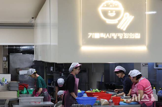 [서울=뉴시스] 권창회 기자 = 염영남 뉴시스 대표이사를 비롯한 직원들이 8일 서울 용산구 가톨릭사랑평화의집에서 도시락 배달 봉사를 하기 위해 음식을 만들고 있다. 2025.07.08. kch0523@newsis.com