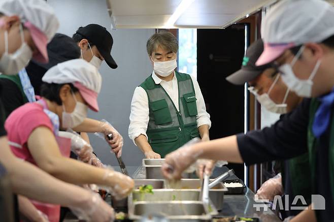 [서울=뉴시스] 권창회 기자 = 염영남 뉴시스 대표이사를 비롯한 직원들이 8일 서울 용산구 가톨릭사랑평화의집에서 도시락 배달 봉사를 하기 위해 음식을 포장하고 있다. 2025.07.08. kch0523@newsis.com