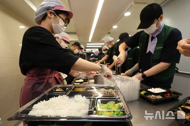 [서울=뉴시스] 권창회 기자 = 염영남 뉴시스 대표이사를 비롯한 직원들이 8일 서울 용산구 가톨릭사랑평화의집에서 도시락 배달 봉사를 하기 위해 음식을 포장하고 있다. 2025.07.08. kch0523@newsis.com