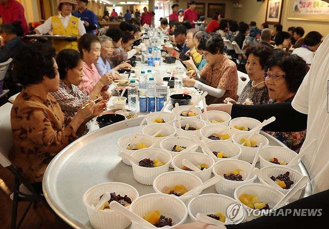 (부산=연합뉴스) 강선배 기자 = 8일 부산 금정구 남광종합사회복지관에서 사회복지공동모금회(삼천리 웰텍)와 금정구 적십자봉사원 등이 무더위에 지친 지역 내 어르신들에게 여름철 보양식인 곰탕 250인분을 대접하고 있다. 2025.7.8