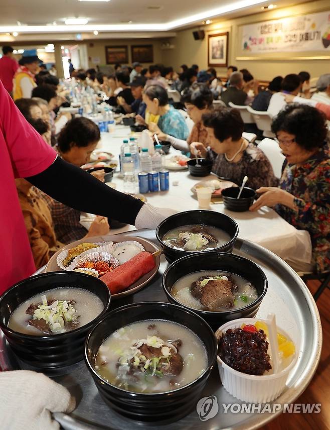 (부산=연합뉴스) 강선배 기자 = 8일 부산 금정구 남광종합사회복지관에서 사회복지공동모금회(삼천리 웰텍)와 금정구 적십자봉사원 등이 무더위에 지친 지역 내 어르신들에게 여름철 보양식인 곰탕 250인분을 대접하고 있다. 2025.7.8