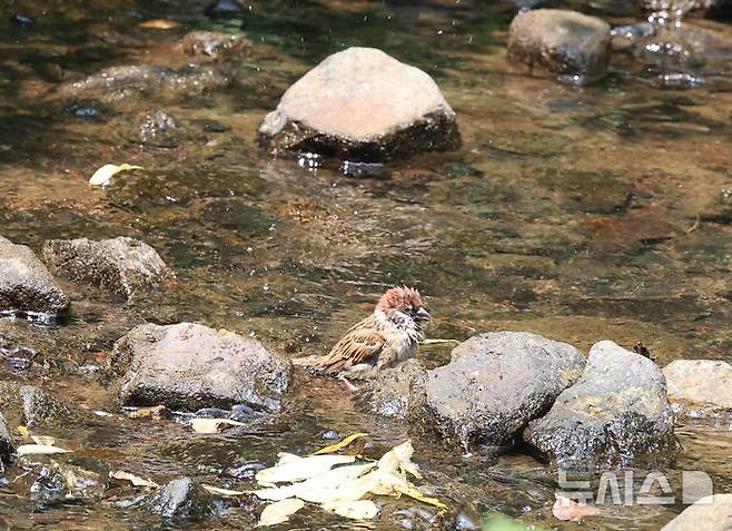 [인천=뉴시스] 전진환 기자 = 폭염이 이어지는 8일 인천 남동구 장수천에서 참새 한 마리가 목욕을 하며 더위를 식히고 있다. 2025.07.08. amin2@newsis.com
