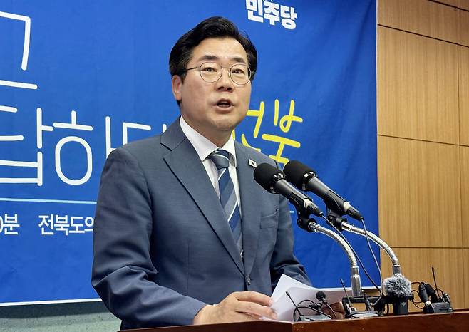 | ▲ 더불어민주당 당권 주자인 박찬대 의원이 8일 전북특별자치도의회 기자회견에서 발언하고 있다. |