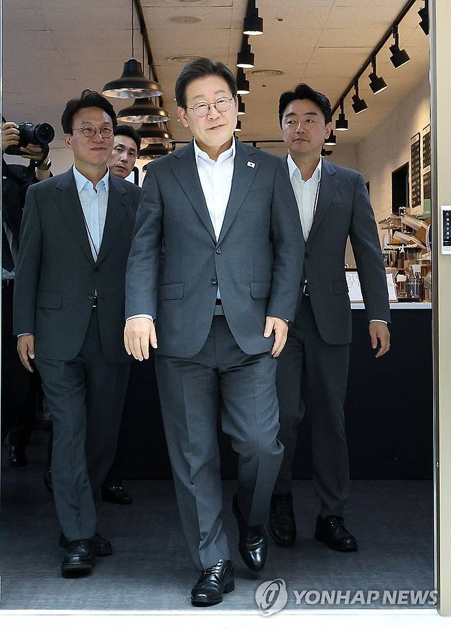(서울=연합뉴스) 한상균 기자 = 이재명 대통령이 8일 용산 대통령실 매점에서 나오고 있다. 이 대통령은 직원식당에서 식사 후 매점에서 만난 기자들과 차를 마시며 대화했다. 2025.7.8 [대통령실통신사진기자단]