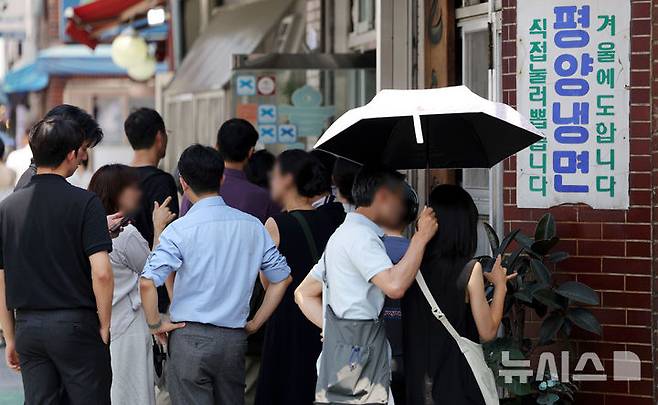 [서울=뉴시스] 홍효식 기자 = 연일 찜통더위가 이어지고 있는 8일 서울 시내 한 냉면 전문점을 찾은 시민들이 입장을 기다리고 있다. 2024.07.08. yesphoto@newsis.com