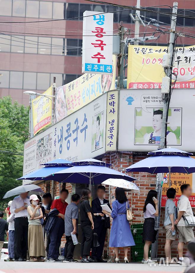 [서울=뉴시스] 홍효식 기자 = 연일 찜통더위가 이어지고 있는 8일 서울 시내 한 냉 콩국수 전문점을 찾은 시민들이 입장을 기다리고 있다. 2024.07.08. yesphoto@newsis.com