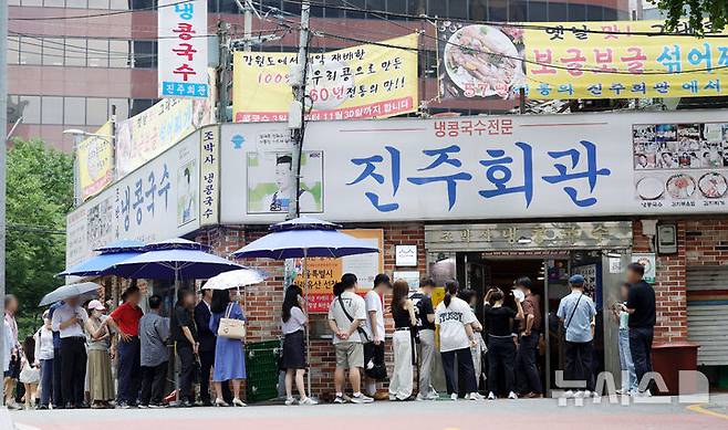 [서울=뉴시스] 홍효식 기자 = 연일 찜통더위가 이어지고 있는 8일 서울 시내 한 냉 콩국수 전문점을 찾은 시민들이 입장을 기다리고 있다. 2024.07.08. yesphoto@newsis.com
