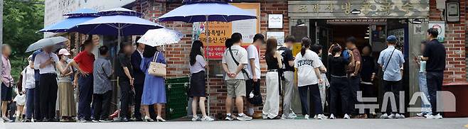 [서울=뉴시스] 홍효식 기자 = 연일 찜통더위가 이어지고 있는 8일 서울 시내 한 냉 콩국수 전문점을 찾은 시민들이 입장을 기다리고 있다. 2024.07.08. yesphoto@newsis.com