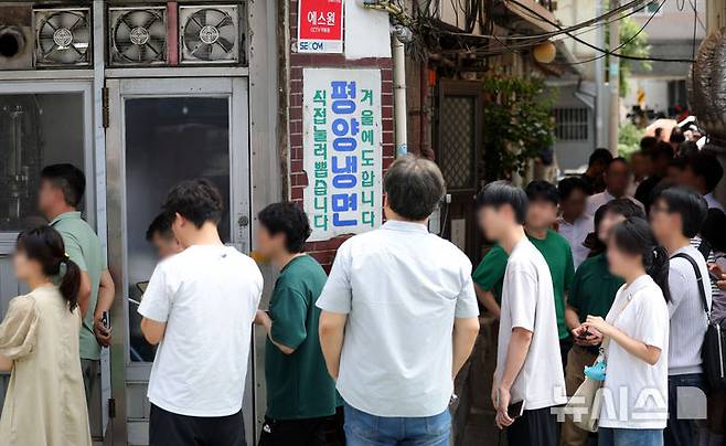 [서울=뉴시스] 홍효식 기자 = 연일 찜통더위가 이어지고 있는 8일 서울 시내 한 냉면 전문점을 찾은 시민들이 입장을 기다리고 있다. 2024.07.08. yesphoto@newsis.com