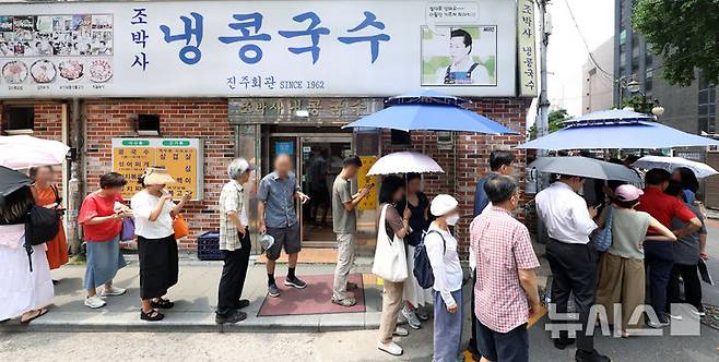 [서울=뉴시스] 홍효식 기자 = 연일 찜통더위가 이어지고 있는 8일 서울 시내 한 냉 콩국수 전문점을 찾은 시민들이 입장을 기다리고 있다. 2024.07.08. yesphoto@newsis.com