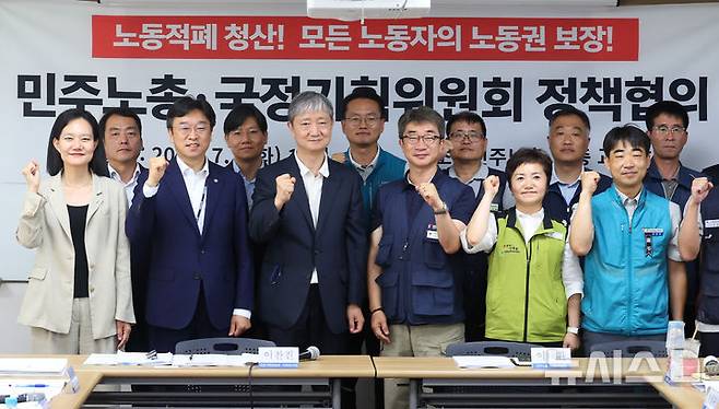 [서울=뉴시스] 최진석 기자 = 이찬진(앞줄 왼쪽 세번째부터) 국정기획위원회 사회1분과장과 이태환 민주노총 수석부위원장이 8일 서울 중구 정동 민주노총 교육장에서 열린 민주노총·국정기획위원회 정책협의에서 참석자들과 기념촬영하고 있다. 2025.07.08. myjs@newsis.com