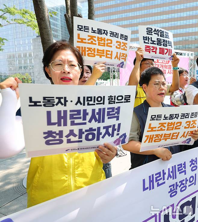 [서울=뉴시스] 최진석 기자 = 전국서비스산업노동조합연맹 조합원들이 8일 서울 종로구 광화문광장에서 서비스연맹 총파업 선포 기자회견에서 총파업 관련 구호를 외치고 있다. 2025.07.08. myjs@newsis.com