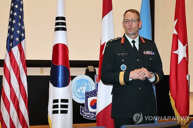(서울=연합뉴스) 데릭 맥컬리 중장(유엔사 부사령관, 캐나다육군)이 8일 경기 평택시 캠프험프리스 유엔사 본청에서 열린 창립 기념행사에서 취재진의 질문에 답하고 있다. 2025.7.8 [사진공동취재단]