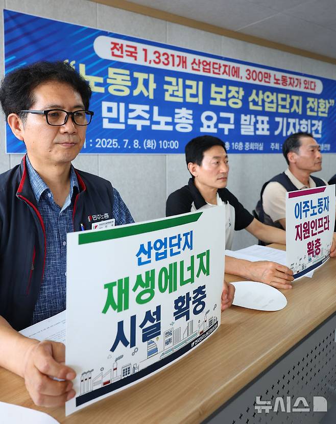 [서울=뉴시스] 최진석 기자 = 민주노총 조합원들이 8일 오전 서울 중구 민주노총에서 열린 '노동자 권리 보장 산업단지 정책 전환 요구 발표 기자회견'에서 산업단지 노동자들의 노동기본권을 촉구하는 피켓을 들고 있다. 2025.07.08. myjs@newsis.com