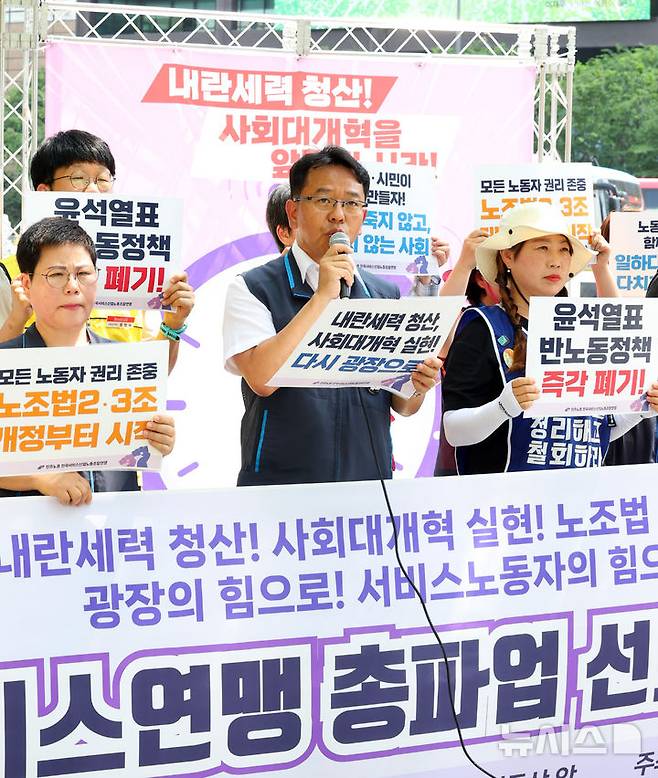 [서울=뉴시스] 최진석 기자 = 8일 서울 종로구 광화문광장에서 열린 서비스연맹 총파업 선포 기자회견에서 김광창 전국서비스산업노동조합연맹 위원장이 발언하고 있다. 2025.07.08. myjs@newsis.com