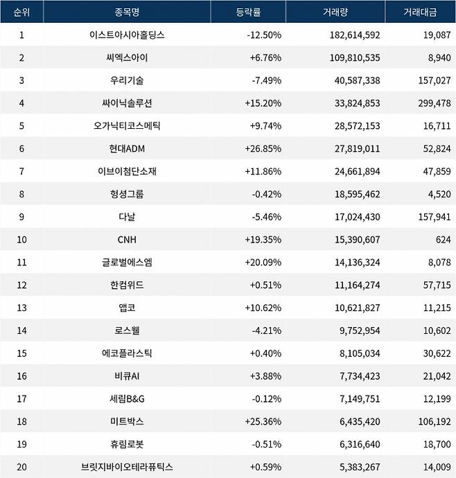 한편 거래량 상위 20위권 종목들은 글로벌에스엠(900070) ▲20.09%, 한컴위드(054920) ▲0.51%, 앱코(129890) ▲10.62%, 로스웰(900260) ▼4.21%, 에코플라스틱(038110) ▲0.40%, 비큐AI(148780) ▲3.88%, 세림B&G(340440) ▼0.12%, 미트박스(475460) ▲25.36%, 휴림로봇(090710) ▼0.51%, 브릿지바이오테라퓨틱스(288330) ▲0.59% 등의 성적을 기록했다.