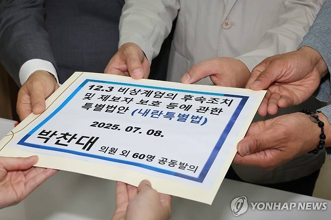(서울=연합뉴스) 김주형 기자 = 더불어민주당 김용민, 박성준, 노종면 의원이 8일 서울 여의도 국회 의안과에서 박찬대 의원이 발의한 '내란특별법' 안을 제출하고 있다. 2025.7.8