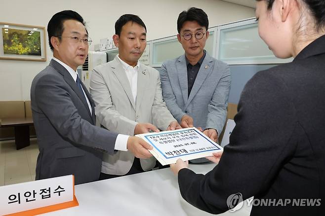 (서울=연합뉴스) 김주형 기자 = 더불어민주당 박성준(왼쪽부터),, 김용민, 노종면 의원이 8일 서울 여의도 국회 의안과에서 박찬대 의원이 발의한 '내란특별법' 안을 제출하고 있다. 2025.7.8