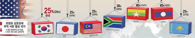 한편 관세 서한 대상 14개국에는 우리나라와 일본을 비롯해 말레이시아, 인도네시아, 태국, 캄보디아, 방글라데시, 라오스, 미얀마, 남아프리카공화국, 보스니아헤르체고비나, 세르비아, 카자흐스탄, 튀니지가 포함됐다. 이 가운데 한국·일본은 25% 관세가, 나머지 국가들은 25~40% 수준의 상호관세율이 개별 설정된 것으로 알려졌다.