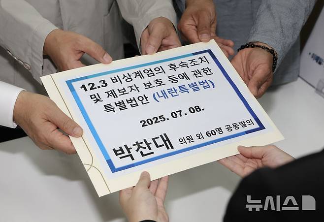 [서울=뉴시스] 김명년 기자 = 박성준, 김용민, 노종면 더불어민주당 의원이 8일 오후 서울 여의도 국회 의안과에서 박찬대 당대표 후보 발의 내란특별법안을 제출하고 있다. 2025.07.08. kmn@newsis.com
