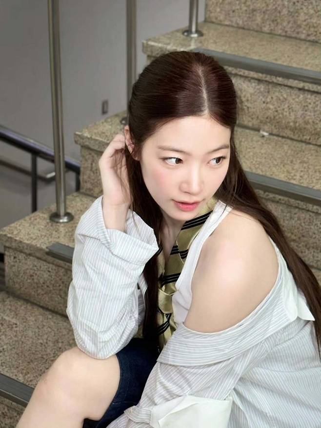 어깨에 살짝 걸친 스트라이프 셔츠는 한쪽 소매를 흘러내리게 연출해 자연스러운 무드를 더했고, 데님 하의와 함께 청량한 교복 느낌으로 소화했다.