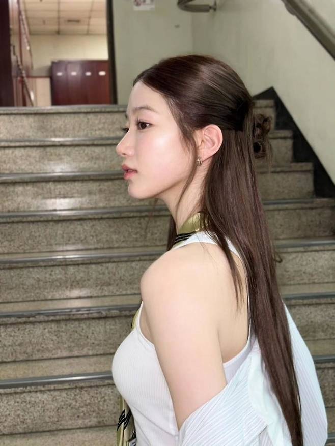 긴 생머리의 반묶음 헤어스타일은 단정하면서도 소녀스러운 분위기를 배가했다.