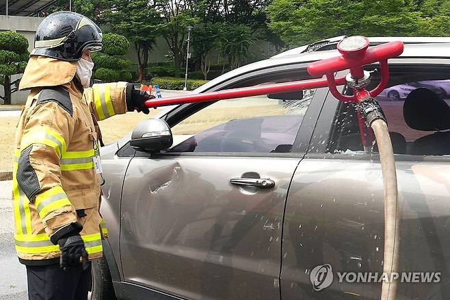(광주=연합뉴스) 8일 오전 광주 광산구 광주소방학교에서 광주소방본부 소속 119구조대원들이 전기차 화재 대응 훈련을 하고 있다. 2025.7.8 [광주소방본부 제공. 재판매 및 DB 금지]