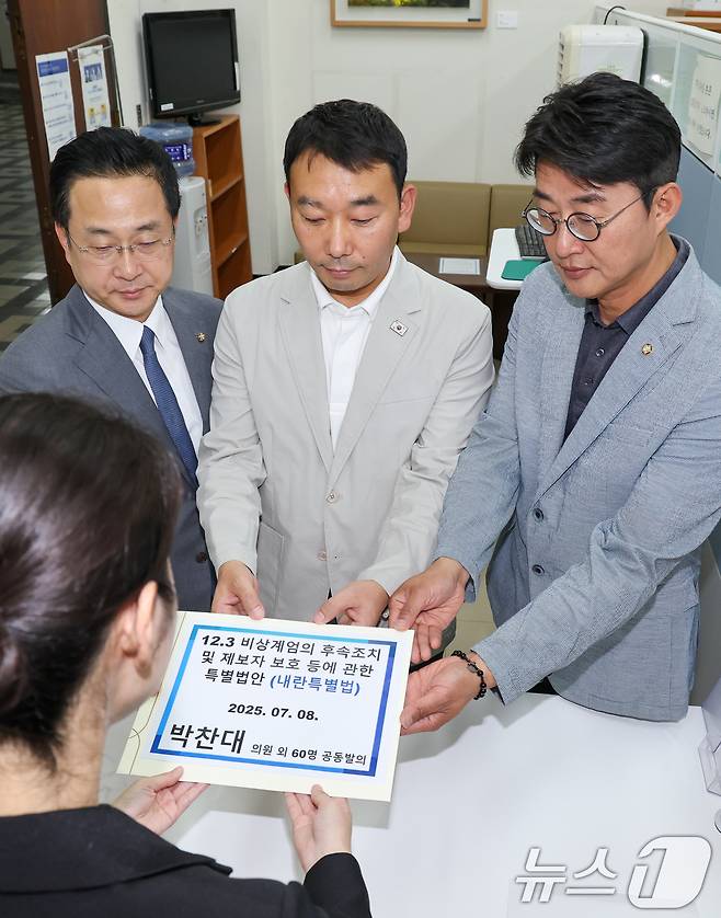 (서울=뉴스1) 안은나 기자 = 박성준(왼쪽부터), 김용민, 노종면 더불어민주당 의원이 8일 오후 서울 여의도 국회 의안과에서 박찬대 당대표 후보 등과 공동 발의한 내란특별법안을 제출하고 있다. 2025.7.8/뉴스1