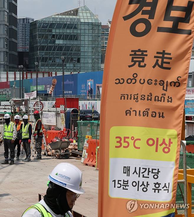 (서울=연합뉴스) 이진욱 기자 = 8일 폭염 경보가 발효 중인 서울 강남구 한 공사현장에 '체감온도 경보' 안내문이 설치돼 있다. 관계자는 근로자들이 45분 작업, 15분 휴식을 하고 있다고 밝혔다. 2025.7.8