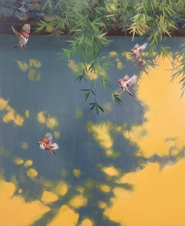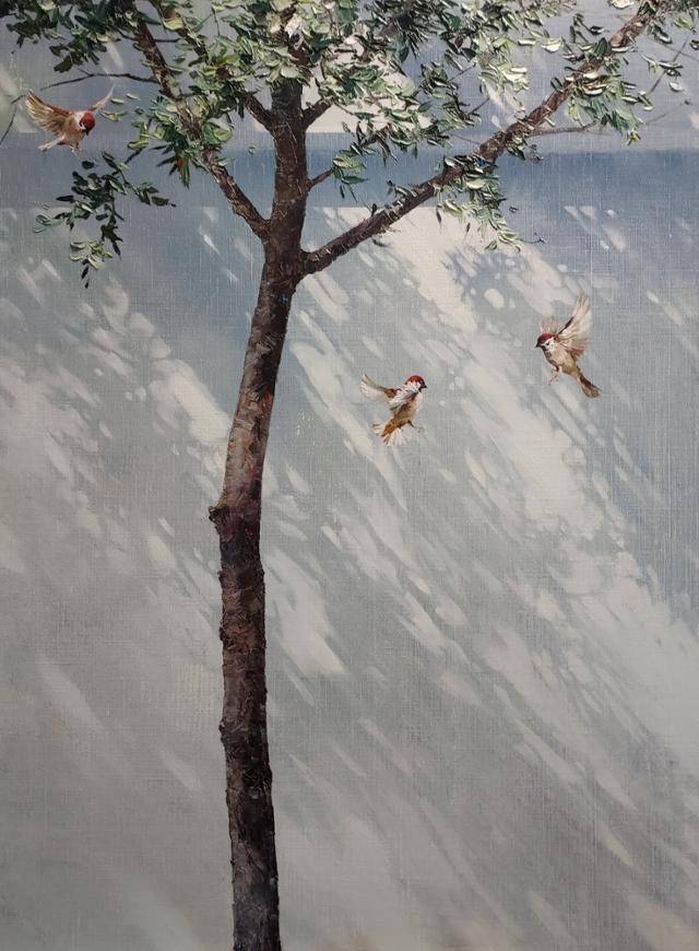 이 시리즈는 실제의 나무와 참새를 그리고, 그 뒤에 비추는 ‘빛의 그림자’를 캔버스에 담아낸 작업이다. 현실과 그림자, 존재와 흔적, 새의 생동과 나무의 고요함이 겹치는 순간들이 이 작품들의 주제다. 햇살 가득한 정오, 나뭇잎 사이로 스며든 빛이 바닥에 수묵화처럼 번진다. 그 위를 자유롭게 날아다니는 작은 참새들. 가장 가볍고 조용하지만, 분명한 존재감으로 세상을 스쳐가는 그것은 어느 순간 작가 내면의 감정을 건드리는 풍경이 되었다. 작가는 그 조용한 장면을 화폭에 담아냈다.