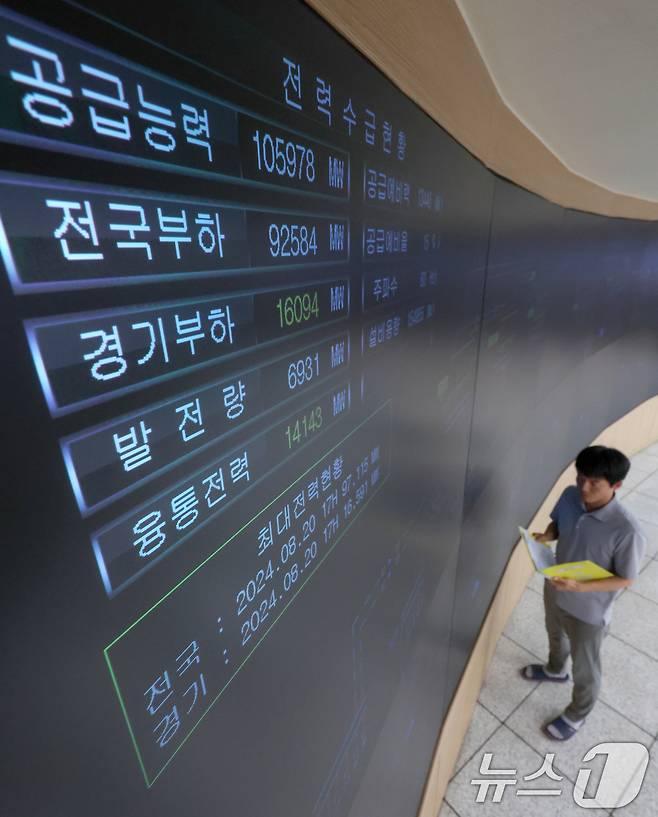 (수원=뉴스1) 김영운 기자 = 폭염이 이어지며 전력 수요가 급증하고 있는 8일 오후 경기 수원시 영통구 한국전력공사 경기본부 전력관리처 계통운영센터에서 관계자들이 전력수급상황을 주시하고 있다. (공동취재) 2025.7.8/뉴스1