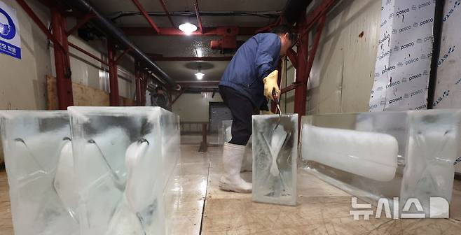 [인천=뉴시스] 전진환 기자 = 연일 폭염이 이어지는 8일 경기도 부천시 오정구의 한 얼음공장에서 직원이 생산한 얼음을 옮기고 있다. 2025.07.08. amin2@newsis.com