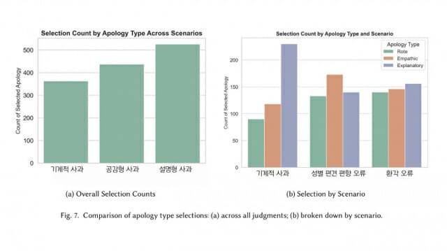 편견과 관련된 실수에서는 설명형 사과보다 공감형 사과가 더 선호되었다. 이는 도덕적으로 민감한 문제에서는 사용자의 감정적 피해를 인정하고 공감하는 것이 더 중요하다는 의미다. 반면 사실 오류에서는 명확하게 설명형 사과가 선호되었다.